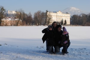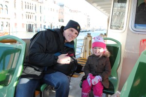 We got to Venice, and we faced the reality that you really do have to park outside of the city and then haul all of your stuff with you to the hotel. Nothing is built to be easy (like in the U.S.). We realized the task ahead of us as soon as we left the parking garage. No clear signs regarding which way to go. After about 20 minutes, we found the water-taxi station. Oh yea, and it was snowing the whole time… in Venice! We boarded the water bus, which is basically the public bus / subway system for Venice. It seemed like we were the only tourists on board. We had a ton of luggage. I’m sure that people thought we were crazy (Americans), or a royal family or something (but why would we be taking the water taxi). To my knowledge, nothing was stolen today. We felt safe; the people seem relatively nice. There are places to sit inside of the water taxi. We had to leave some of our luggage outside on the deck… it got crowded a couple of times, so I stayed outside on the deck (cold… snow…) to watch the two bags that were out there. Katie and the kids stayed inside with the other bags. Pretty cool though. You see all these famous places and it feels like an everyday thing…