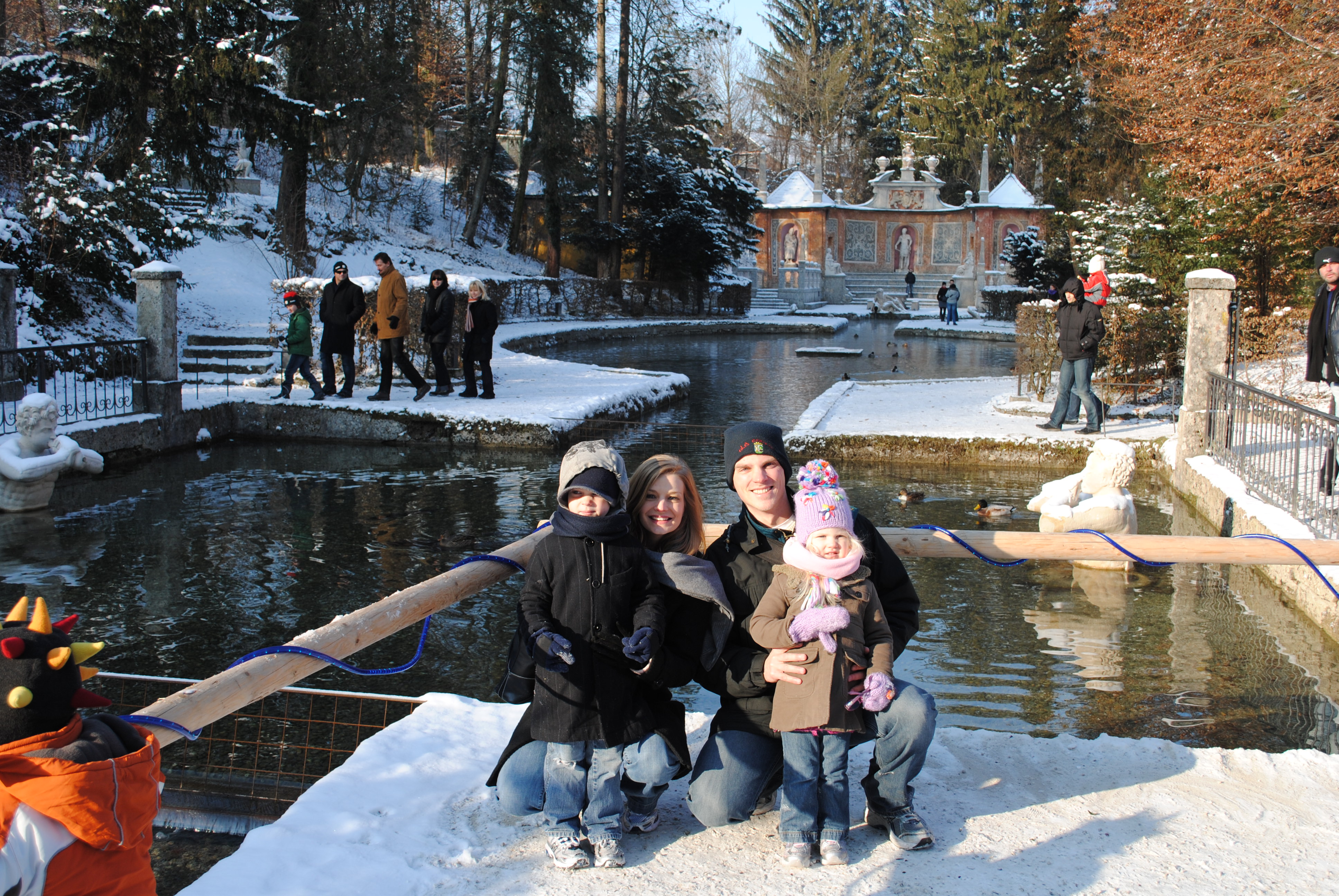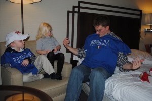 Katie woke up early – good girl! Daddy was tired. Kids were up around 8:00 am, and daddy shortly after. We all got ready, and then we had a wonderful breakfast in the hotel – they serve great breakfasts. This was really wonderful and we took our time. We were sitting next to a glass window and we watched the snow falling on the already-covered ground. Looks like they had about one foot of snow. It was really beautiful. Like a winter wonderland!