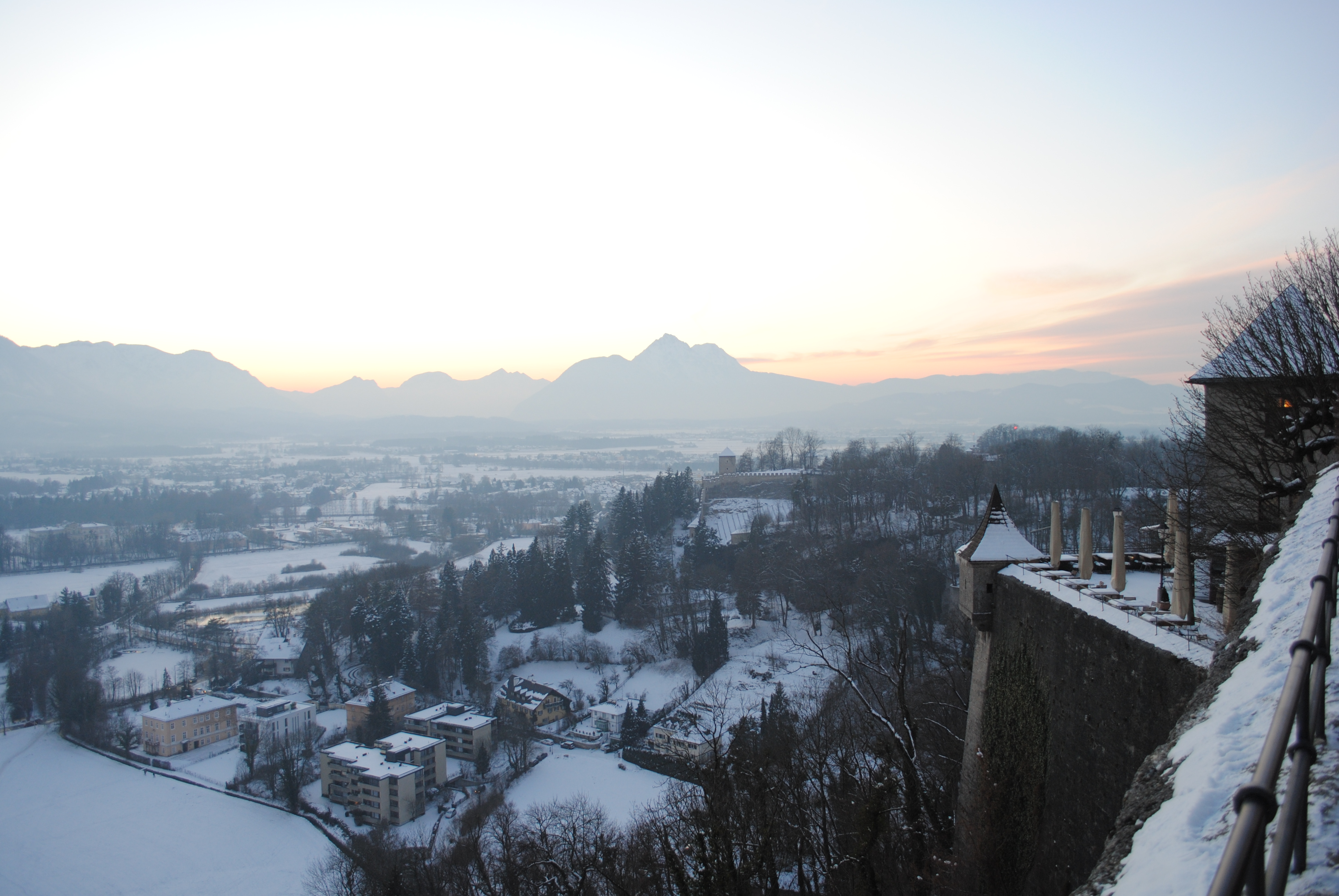 After the tour, we walked through the city, then found a nice little spot for lunch. After the late lunch, we rode up the “mountain trolley” to the fortress that overlooks the town. Very spectacular! We spent time up in that fortress and saw four men playing horns, great views, a Christmas market up there! We saw where they hid the cannons, and also a puppet museum. It was cold up there. We rode the “Waggon Train” back down the hill and then walked back to the hotel (probably about 1.5 km). Ordered a pizza and had it delivered (not as common as in the U.S. but we found a place). I think it was the owner who brought us a pizza. In bed; legs are tired. We loved Salzburg – it is beautiful – like who-ville without the weird who’s…