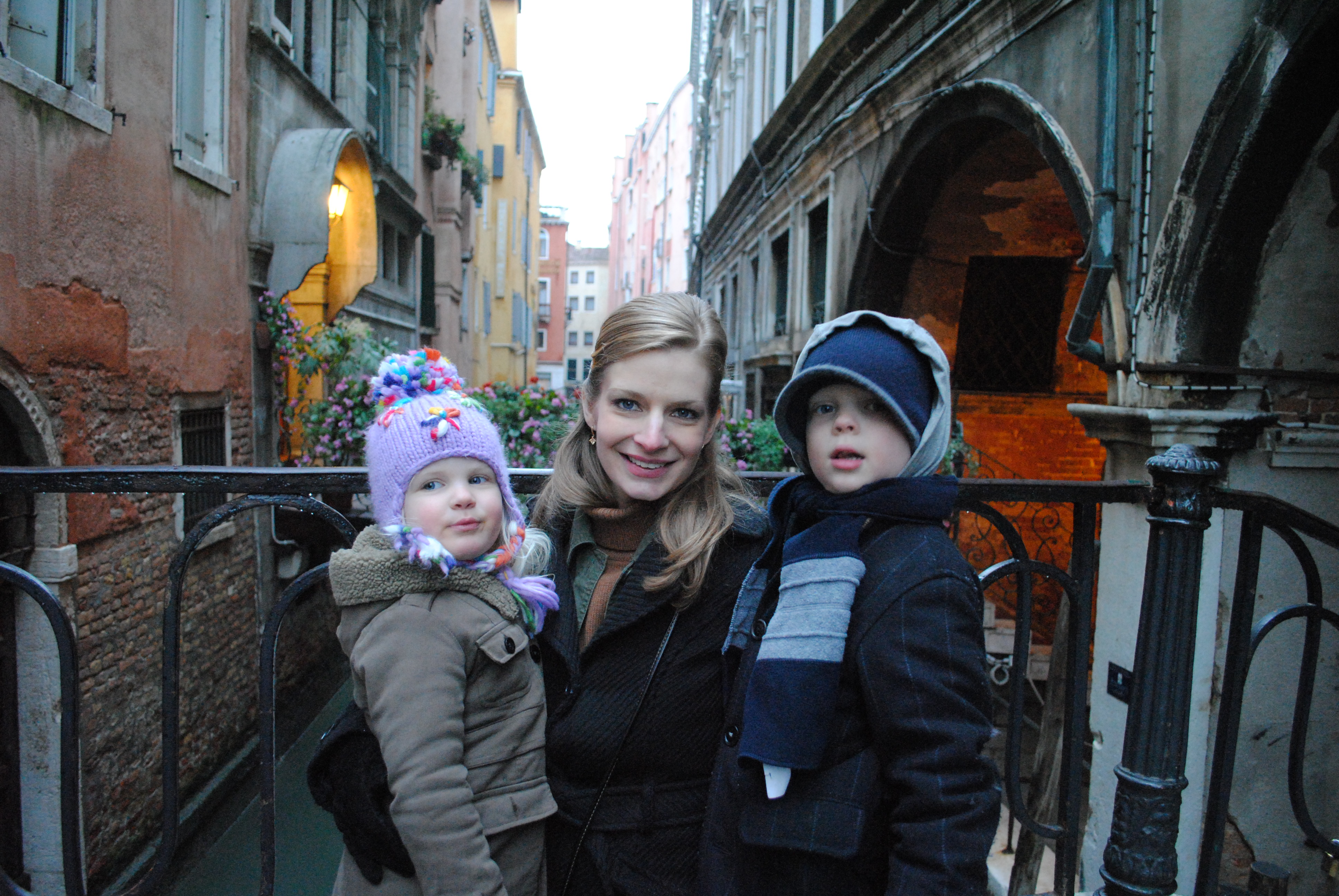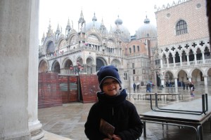 Katie was up early again this morning. I think she continues to be excited about Venice! The kids and I joined her around 8:15 am. We had a lovely breakfast here at the hotel… although not quite as nice as Salzburg! After breakfast, we headed out to Piazza San Marco (St. Mark’s Square) and saw the sights. We visited the Basilica San Marco (St. Mark’s Church) which is beautiful. After that, we had to go back to the hotel to change Kallie’s pants. No problem, as our hotel is a five minute walk from the square. We are staying at the Hotel Torino; it is one of the oldest families in Venice. After the new drawers, we went to a very special restaurant for lunch, called the Hosteria ai Coristi, owned by Armando and Adriano. Adriano was there today, and it was worth every euro cent. This became our fancy meal for the day. After lunch, we walked back to the square, and then toured the Doge’s Palace. This is where the “Bridge of Sighs” is located. After that, the rain was picking up a bit. We decided to walk to the Ponte di Rialto and walked along that bridge. The walk home from there was wet and cold. We headed in the general direction of our hotel and finally found it. I ran out again and picked up four ham and cheese (hisp and cass in dutch) sandwiches again from my friend at the Best Western. We ate dinner in the breakfast room of our hotel. It was really fun today walking through the streets of Venice. To me, so far, that is the best thing to do while here.