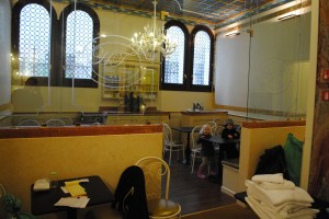 We took the water bus back again (and at last I find out that you really do need to buy a ticket; only no one ever asked, and it took me asking to get this information). We made a brief stop at Redentore; then on to san Marcos Piazza again. We headed home for a bathroom break, a couple of business calls, and then a snack for lunch; then we headed out around 3:30 pm. The tower was closed (bummer) so we couldn’t go up there. We meandered through the streets, heading towards this restaurant that we found out about through the hotel. The streets near the Rialto are shopping center here in Venice. Katie bought a cute red hat. We stopped in a café for about an hour to have hot chocolates and make a couple phone calls to family. 21 Euros for four hot chocolates (that’s 30 dollars for you math wizzes out there). Good thing they are paying me a bunch of money at Summit… wait, I need to sell something!!