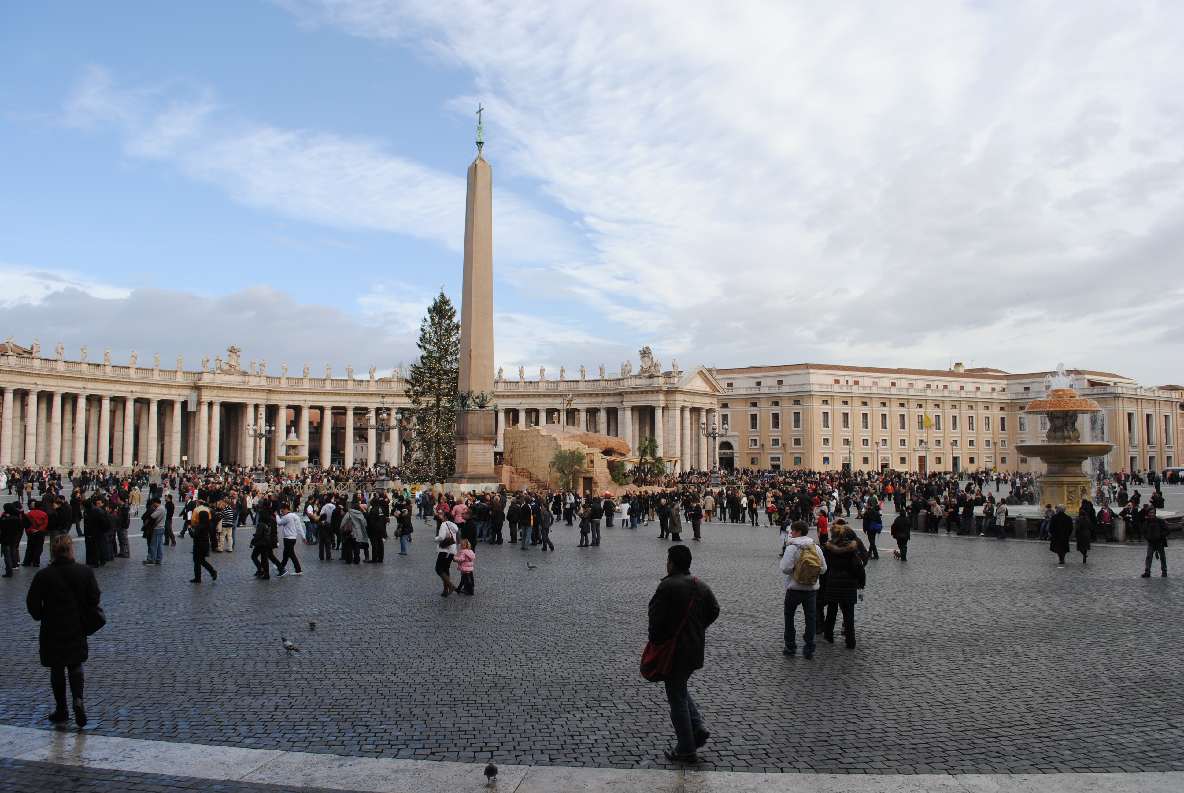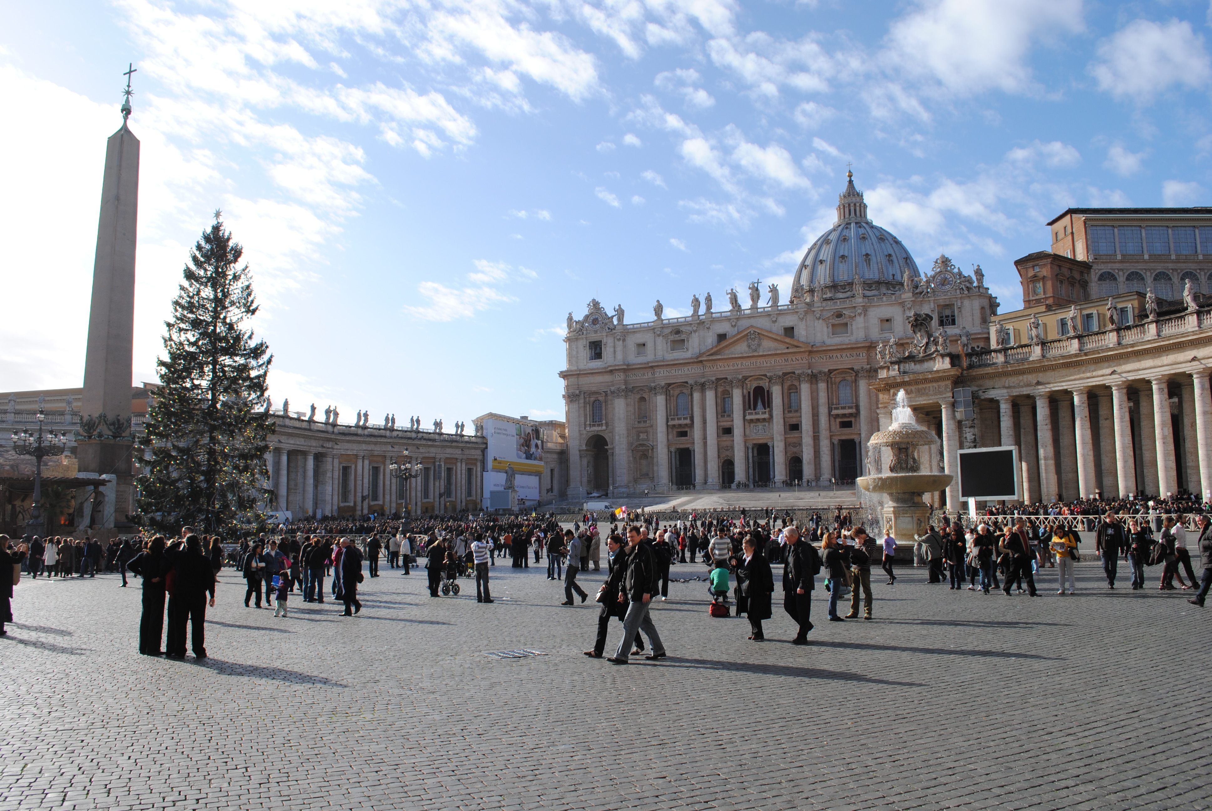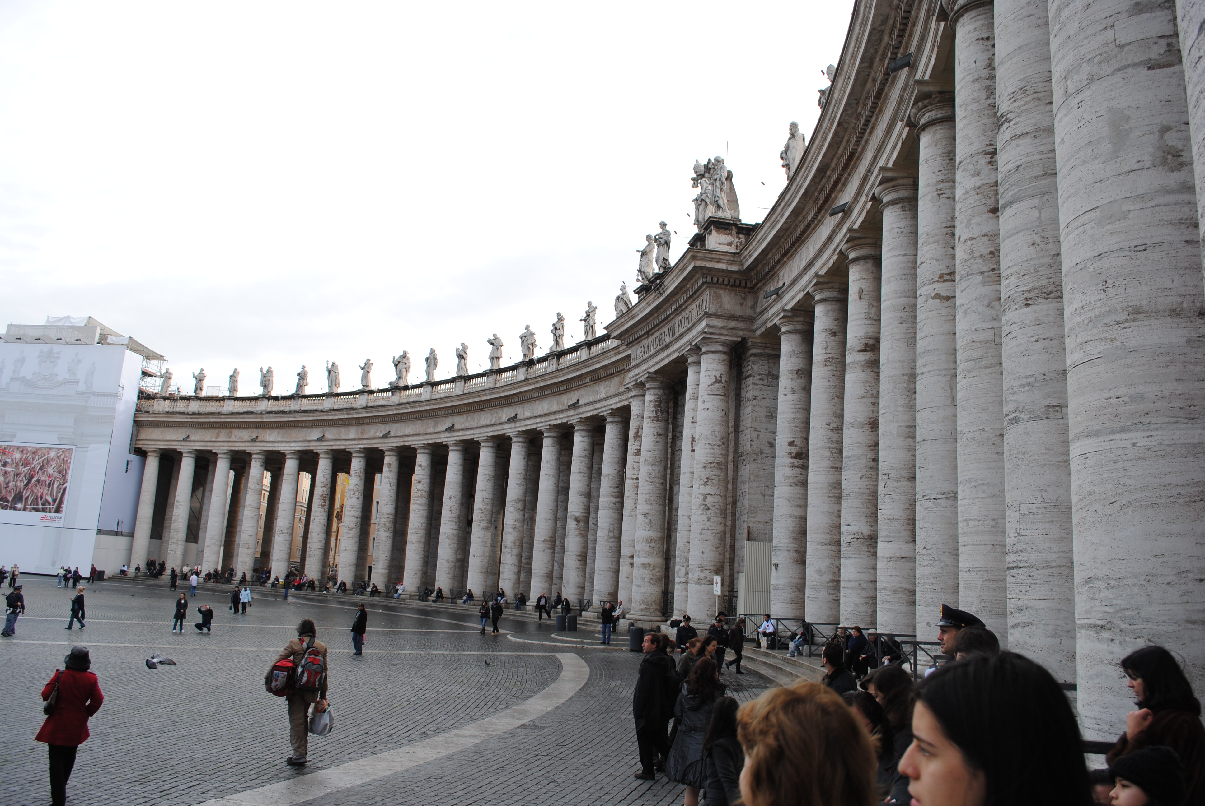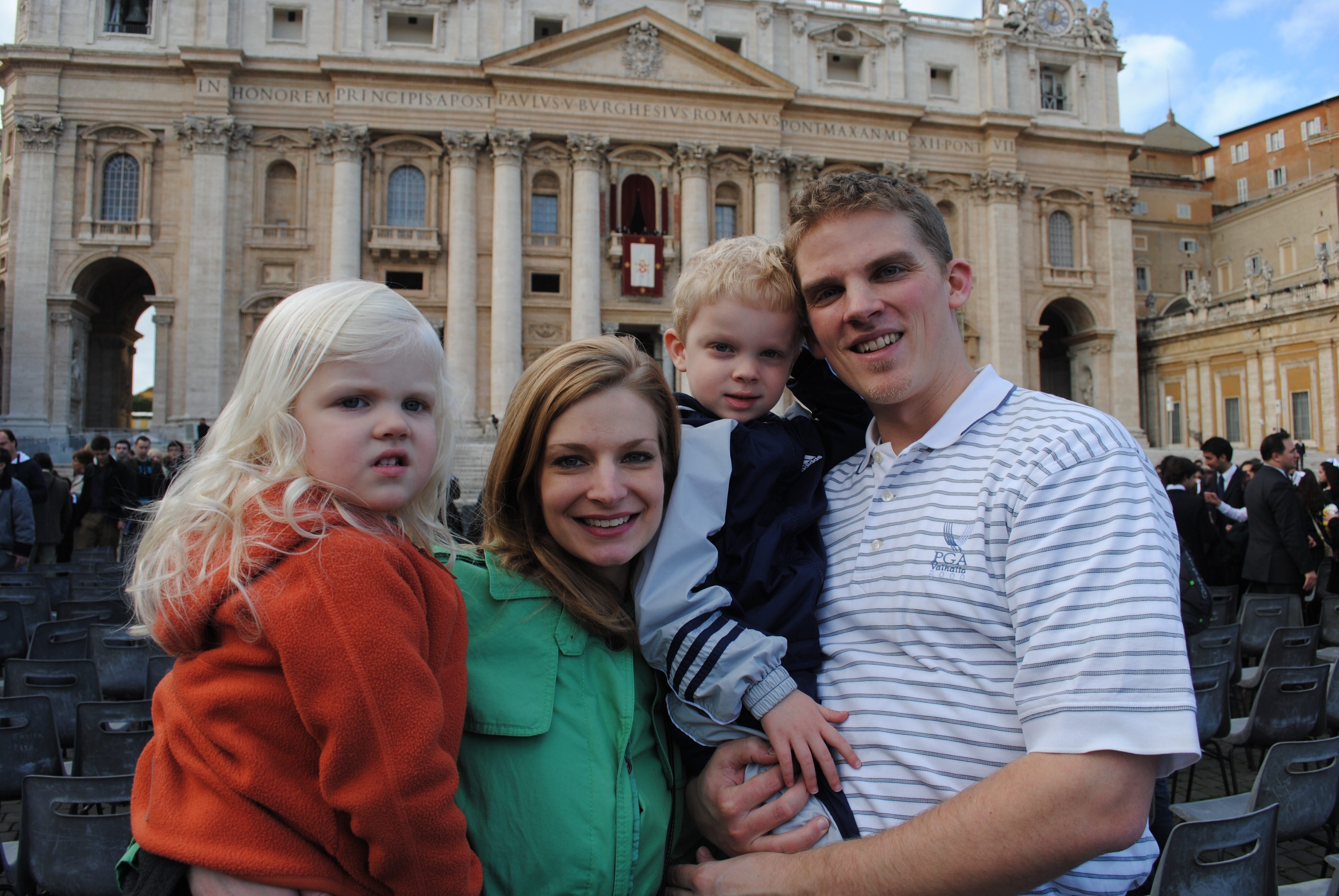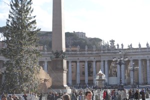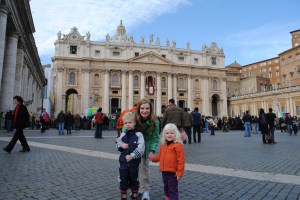 I was up before everyone else this morning… hurray! Katie joined me around 7:45; then the kids. We had a huge breakfast at the hotel – back to the big, grand breakfasts again! After breakfast, we used the potty and then hopped in a taxi for the Vatican. We arrived around 11:00 am, and entered St. Peter’s Square. The crowd was beginning to grow, it was a festive atmosphere. We found four seats together in the front section. Events started around 11:30 with a procession involving several types of guards. The pope made his appearance at 12:00 pm sharp, and gave what seemed to be a lovely benediction. Seeing the pope on Christmas day in Rome… this was the highlight of our day today.
